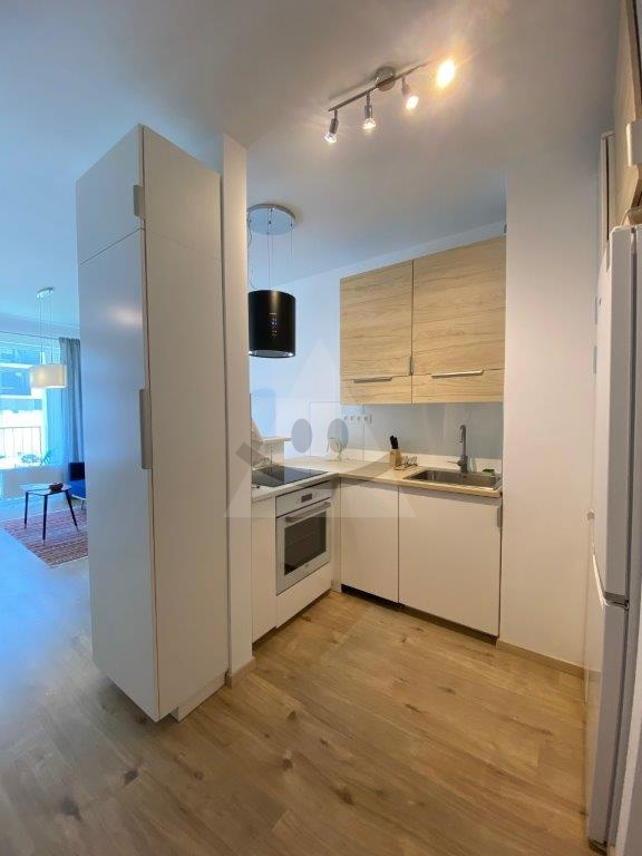 The apartment consists of a kitchen equipped with a dishwasher, a large refrigerator and plenty of storage space.