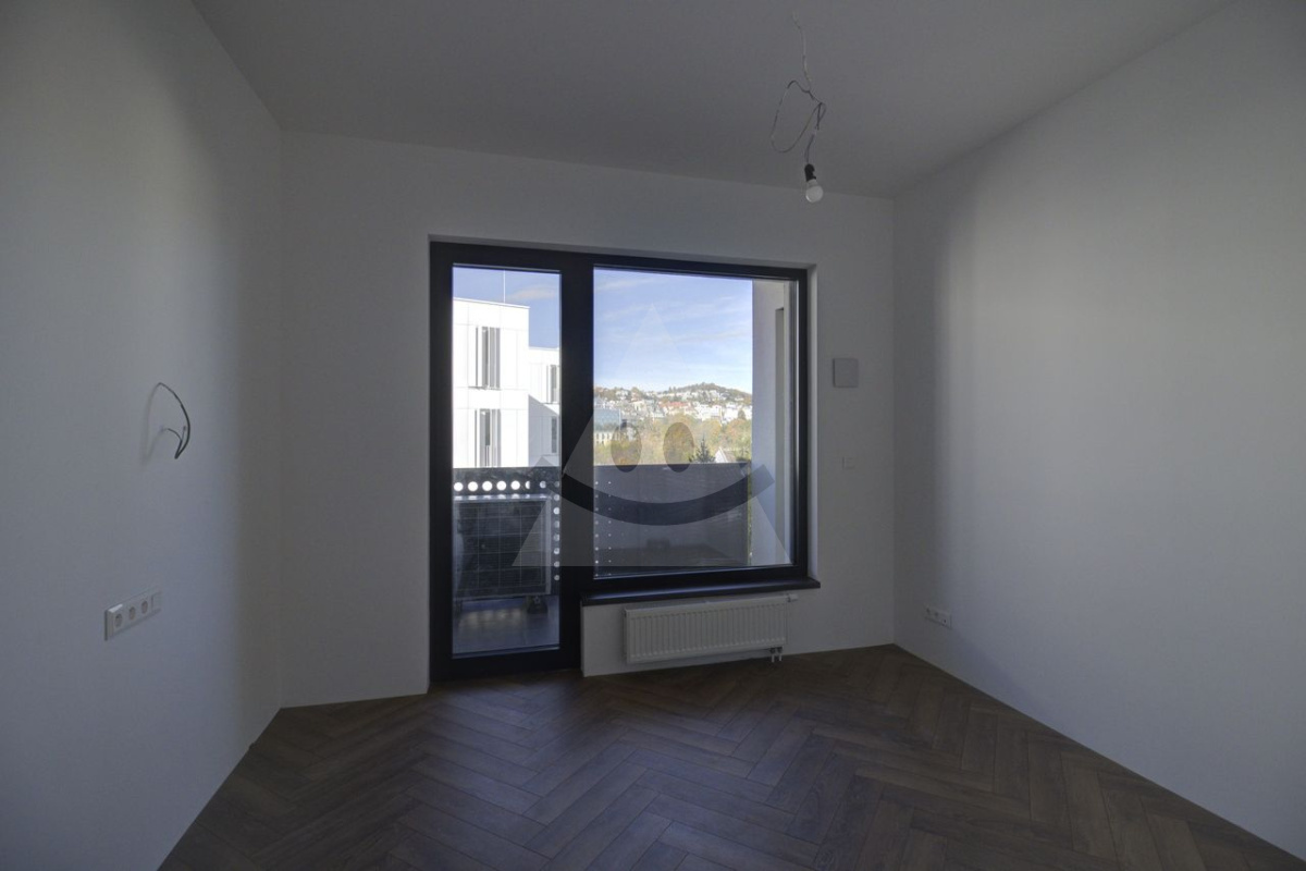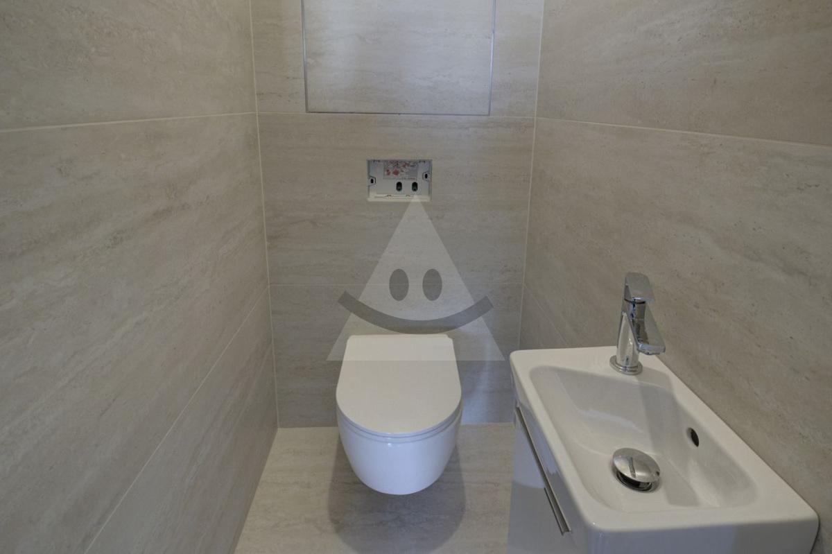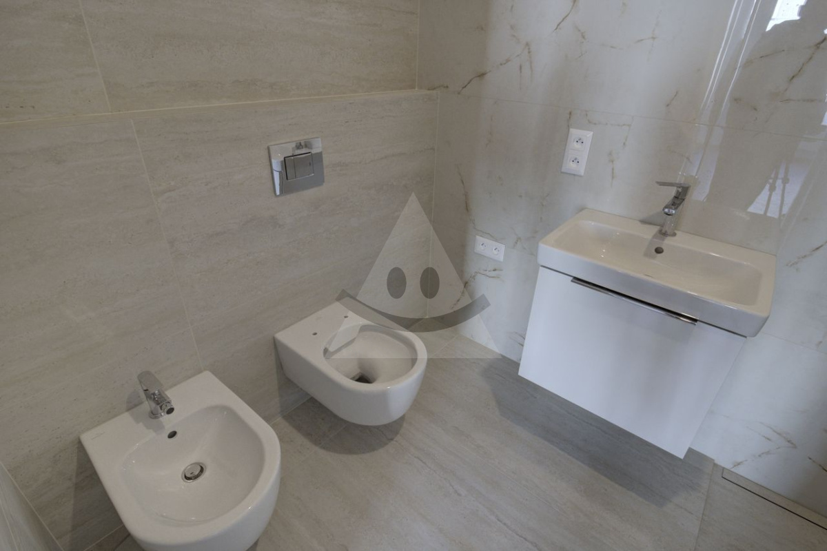 Ide o nový zatiaľ nezariadený byt, bez kuchynskej linky, na podlahe sú drevené parkety, interiérové dvere, na oknách vonkajšie elektrické žalúzie, rekuperácia, klíma, centrálne kúrenie – v izbách sú radiátory, v kúpeľní elektrické podlahové kúrenie aj radiátor. V kúpeľni a WC je osadená sanita, 2x WC, bidet, sprchovací kút, umývadlá.